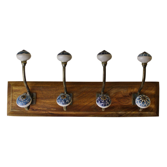 4 Double Ceramic Blue & White Coat Hooks On Wooden Base