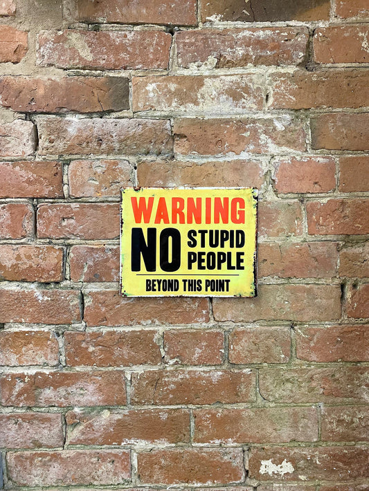 Metal Advertising Wall Sign - Warning No Stupid People Beyond This Point