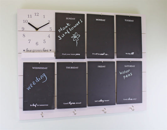 Potting Shed Weekly Reminder Chalkboard With Clock & Hooks, White