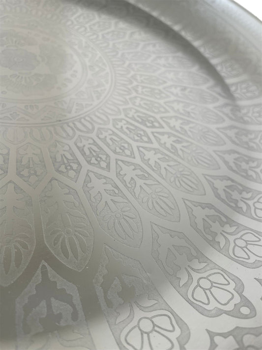 Large Decorative Silver Metal Tray With Etched Design, 42cm