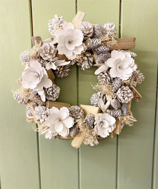 White Flowers & Pinecone Frosted Wreath