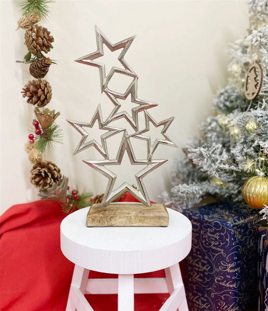 Silver Christmas Tree & Stars On Wooden Base