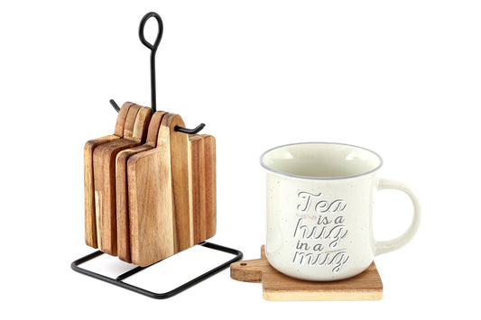 Acacia Coasters With a Black Metal Stand, Set Of 6